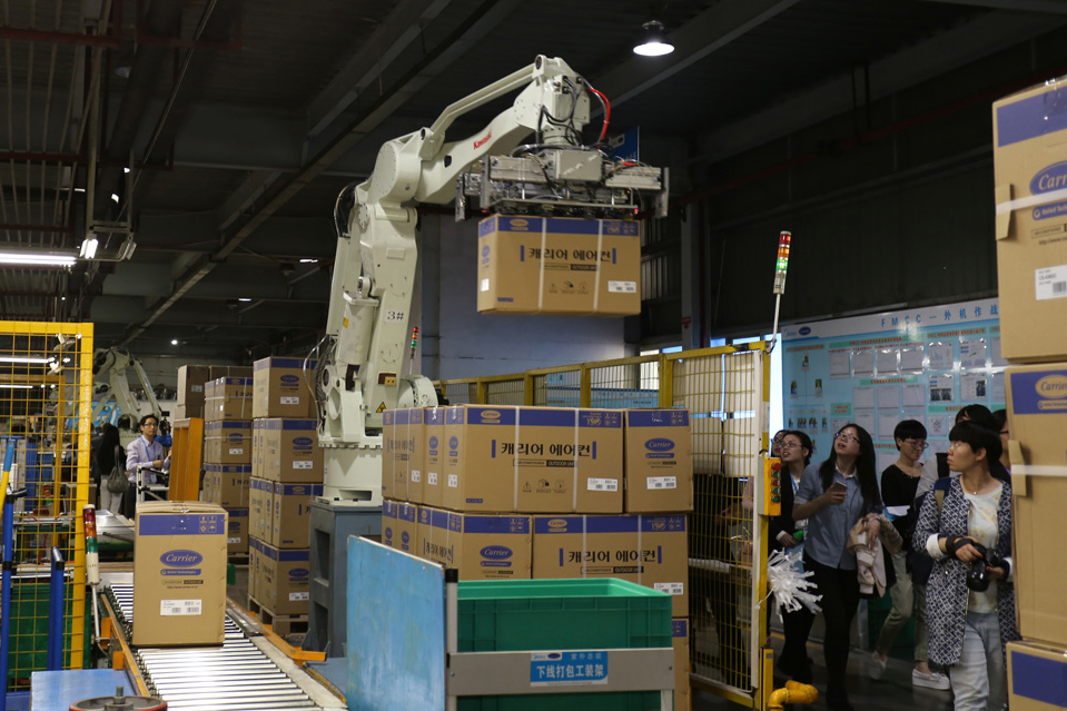 現(xiàn)在的空調(diào)生產(chǎn)線,出現(xiàn)的已不再是擁擠忙碌得跟陀螺似的產(chǎn)業(yè)工人。因?yàn)椴簧俚?span lang="EN-US">“機(jī)器手”、“機(jī)器人”的出現(xiàn),勞動(dòng)密集型的家電制造工廠被賦予了全新的“科技感”和“智能化”的色彩。在空調(diào)室內(nèi)、外機(jī)總裝線體的末端,裝箱、打包等繁重環(huán)節(jié),早已被機(jī)器人所取代。當(dāng)成品從生產(chǎn)線上完成之后,也是通過(guò)機(jī)器手直接搬運(yùn)到流轉(zhuǎn)板上。